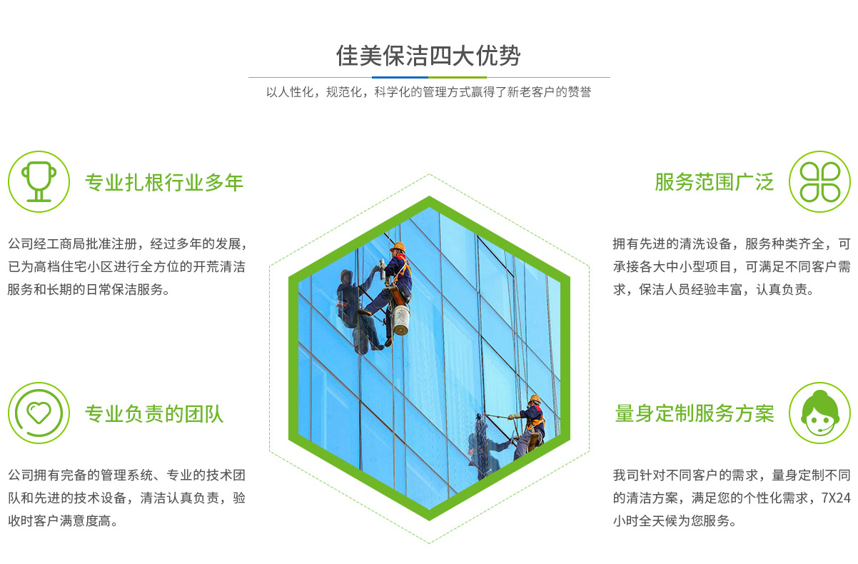 - 馬鞍山市佳美保潔服務有限公司是一家經工商部門批準,具有法人資格專業清洗,馬鞍山保潔服務的公司,自創辦以來,一直致力于企業,家庭,賓館,學校,別墅,酒店,商廈,公共設施等場所提供科學的日常保潔和清潔保護的服務公司,有著豐富的管理服務和保潔經驗...